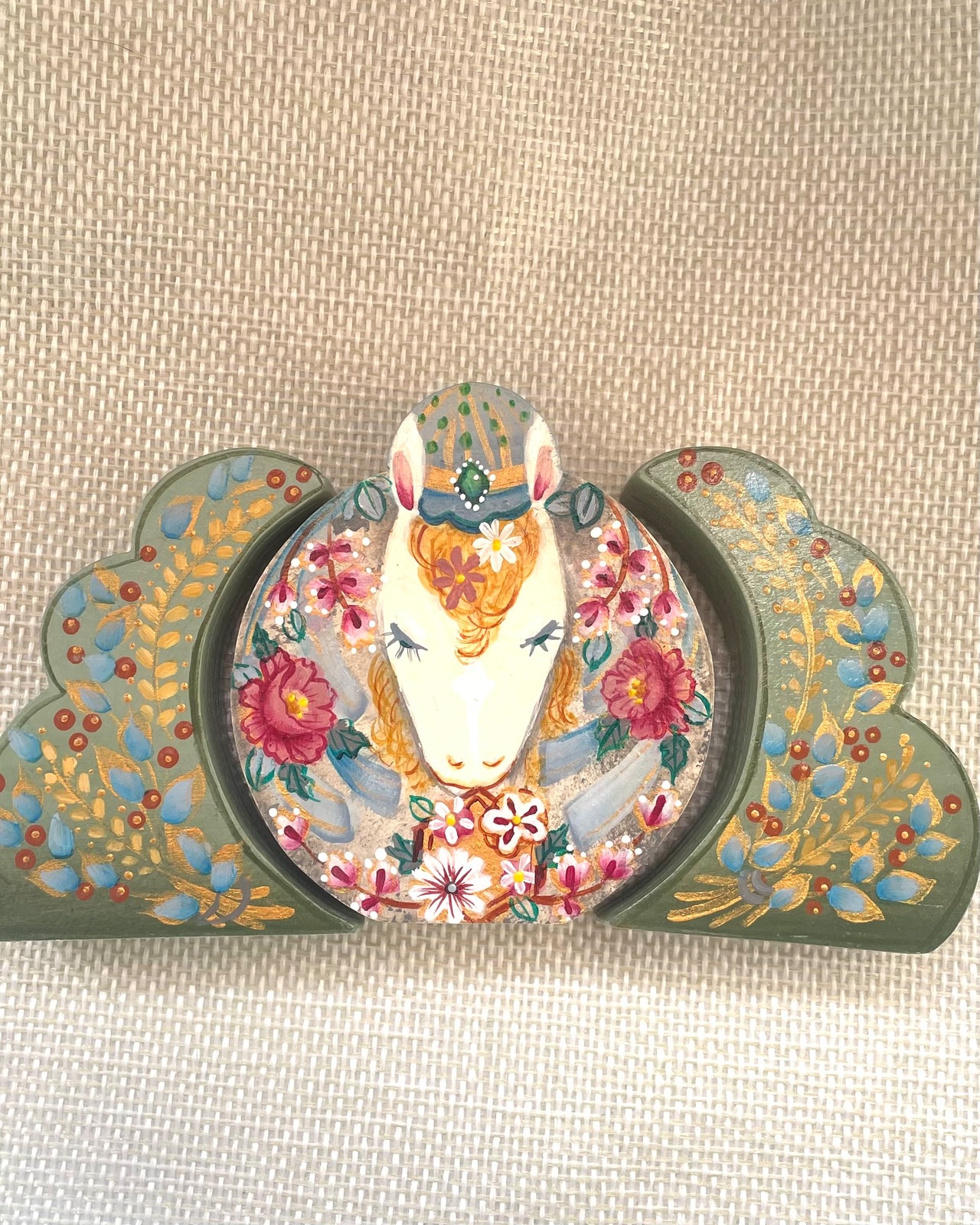 この飾り棚セットには、干支の午をモチーフにした美しい飾りと、シルクスクリーンを使ったオリジナルのインストラクションが含まれています。