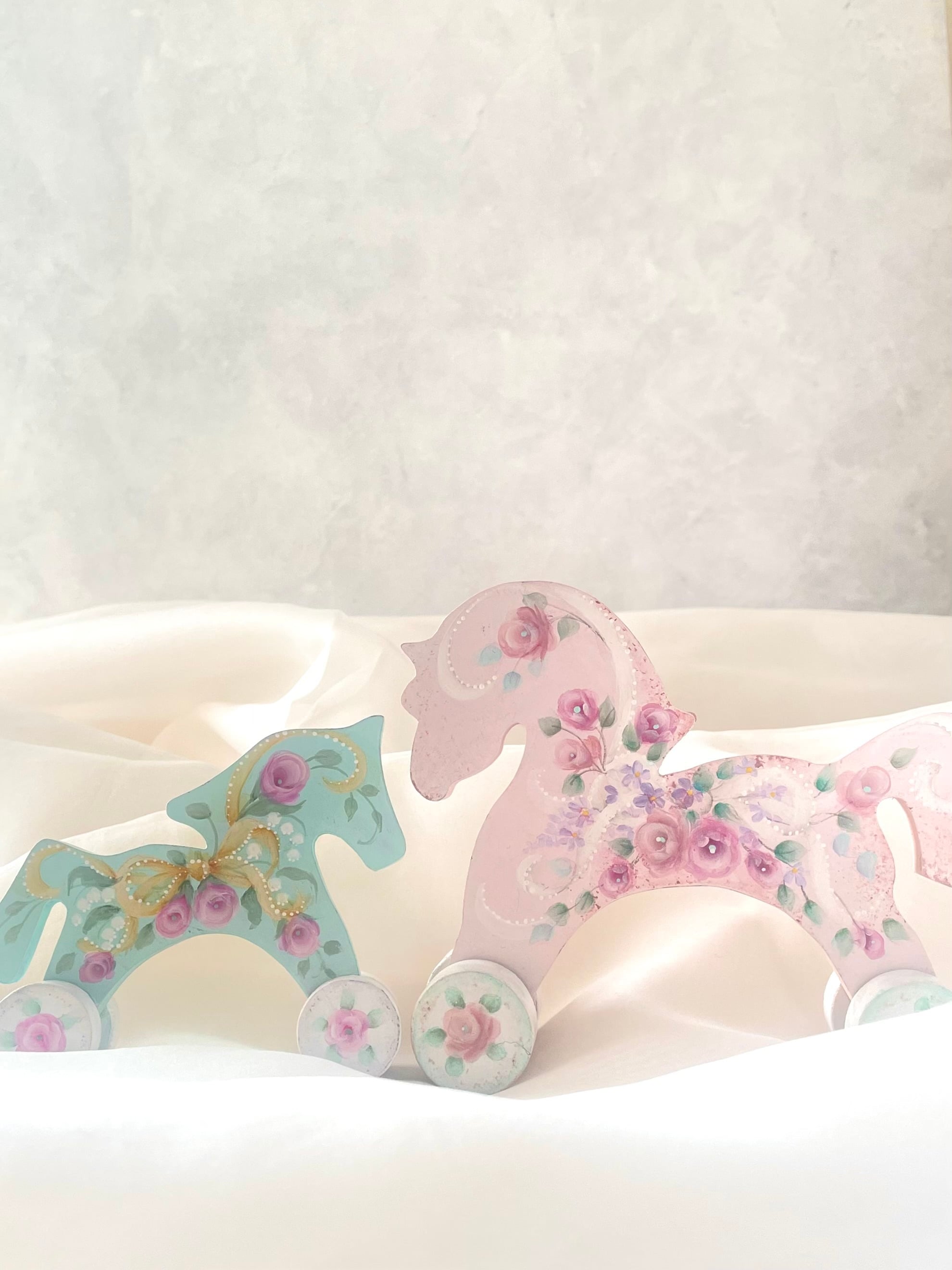 ふんわり優しいパステルカラーとバラとリボンのトールペイントデザインで